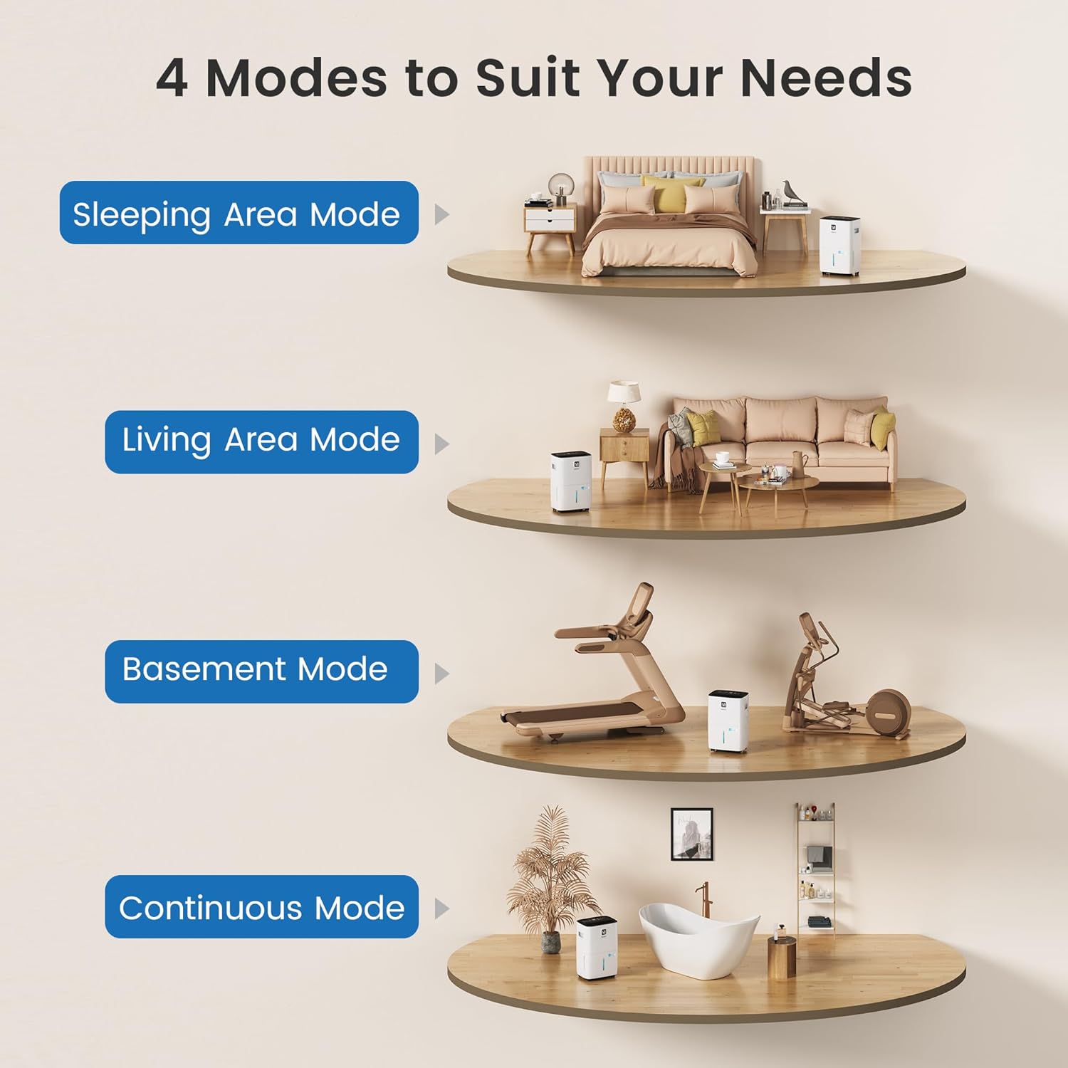 The intelligent humidity control offers four preset modes tailored to specific environments. Sleep Mode maintains 55% relative humidity for comfortable rest, Living Mode targets 50% for daily activities, Basement Mode drops to 45% for damp areas prone to mold, and Continuous Mode runs nonstop in extreme moisture conditions. Unlike standard models limited to 40-80% humidity range, this device adjusts between 30-80%, providing greater customization for diverse climate needs.